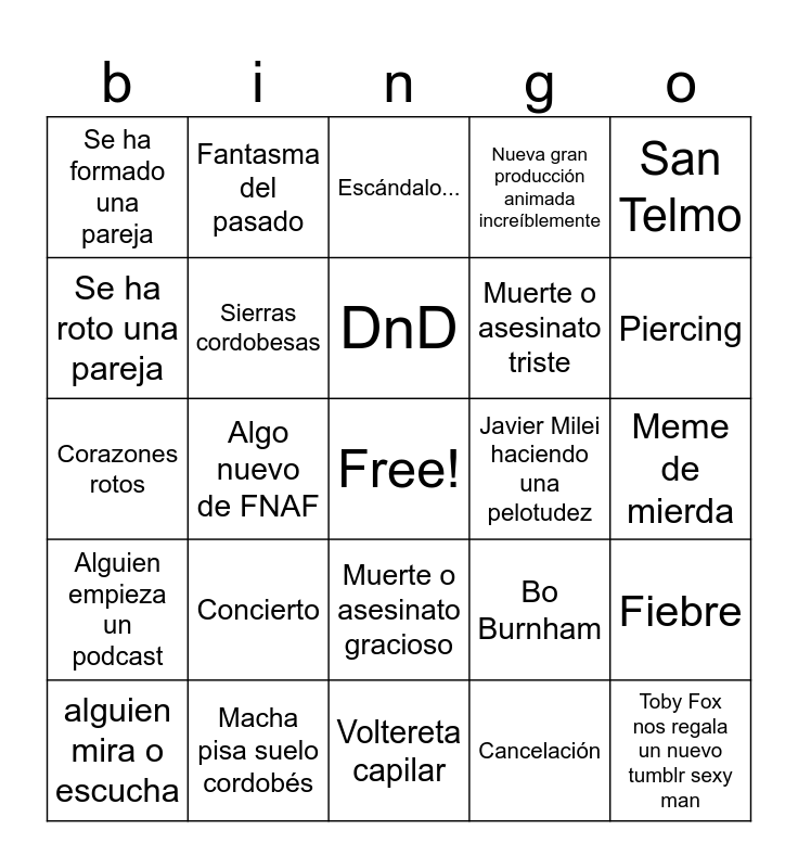 This bingo card has a free space and 24 words: Concierto, Macha pisa suelo cordobés, DnD, alguien mira o escucha, San Telmo, Se ha formado una pareja, Se ha roto una pareja, Fantasma del pasado, Javier Milei haciendo una pelotudez, Muerte o asesinato gracioso, Muerte o asesinato triste, Corazones rotos, Bo Burnham, Fiebre, Sierras cordobesas, Cancelación, Meme de mierda, Escándalo..., Piercing, Algo nuevo de FNAF, Toby Fox nos regala un nuevo tumblr sexy man, Alguien empieza un podcast, Nueva gran producción animada increíblemente and Voltereta capilar.