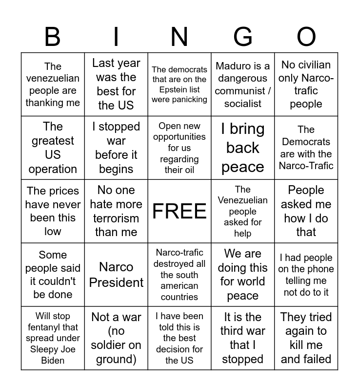 This bingo card has a free space and 24 words: Narco President, Not a war (no soldier on ground), Open new opportunities for us regarding their oil, Will stop fentanyl that spread under Sleepy Joe Biden, No civilian only Narco-trafic people, The venezuelian people are thanking me, The greatest US operation, Last year was the best for the US, The Venezuelian people asked for help, Narco-trafic destroyed all the south american countries, I bring back peace, The prices have never been this low, We are doing this for world peace, I had people on the phone telling me not do to it, I stopped war before it begins, It is the third war that I stopped, People asked me how I do that, The democrats that are on the Epstein list were panicking, The Democrats are with the Narco-Trafic, No one hate more terrorism than me, They tried again to kill me and failed, Some people said it couldn't be done, Maduro is a dangerous communist / socialist and I have been told this is the best decision for the US.