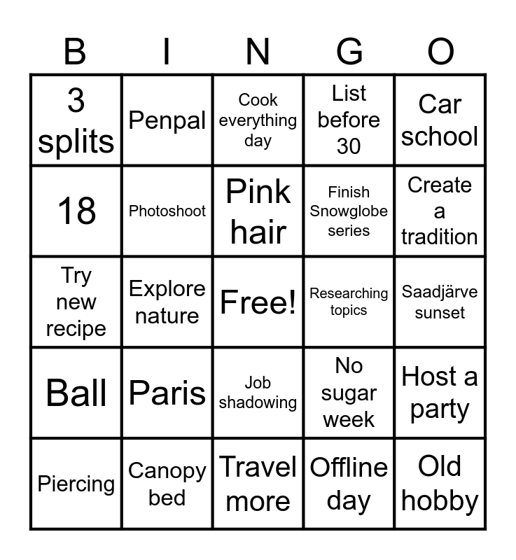 This bingo card has a free space and 24 words: Paris, Canopy bed, Pink hair, Piercing, Car school, 3 splits, 18, Penpal, Researching topics, Job shadowing, Finish Snowglobe series, Try new recipe, No sugar week, Host a party, Photoshoot, Offline day, Saadjärve sunset, Cook everything day, Create a tradition, Explore nature, Old hobby, Ball, List before 30 and Travel more.