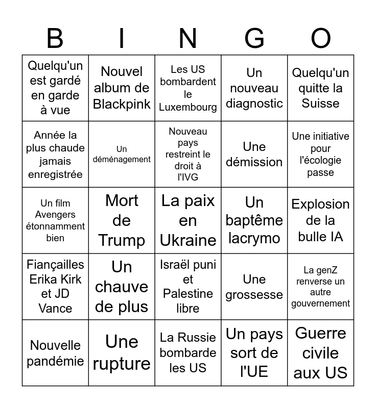 This bingo card has 25 words: Un chauve de plus, La Russie bombarde les US, Nouveau pays restreint le droit à l'IVG, Nouvelle pandémie, Quelqu'un quitte la Suisse, Quelqu'un est gardé en garde à vue, Année la plus chaude jamais enregistrée, Nouvel album de Blackpink, Un baptême lacrymo, Israël puni et Palestine libre, Une démission, Un film Avengers étonnamment bien, Une grossesse, La genZ renverse un autre gouvernement, Un déménagement, Guerre civile aux US, Explosion de la bulle IA, Les US bombardent le Luxembourg, Une initiative pour l'écologie passe, Mort de Trump, La paix en Ukraine, Une rupture, Fiançailles Erika Kirk et JD Vance, Un nouveau diagnostic and Un pays sort de l'UE.