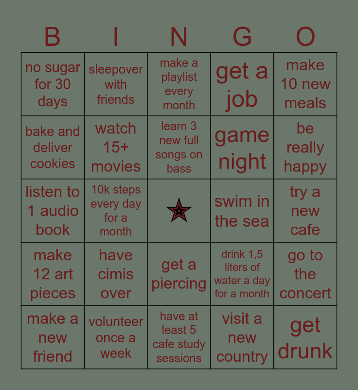 This bingo card has a free space and 24 words: make a new friend, have cimis over, learn 3 new full songs on bass, visit a new country, make 10 new meals, no sugar for 30 days, sleepover with friends, make a playlist every month, swim in the sea, try a new cafe, listen to 1 audio book, watch 15+ movies, drink 1,5 liters of water a day for a month, go to the concert, bake and deliver cookies, volunteer once a week, have at least 5 cafe study sessions, get a job, be really happy, make 12 art pieces, 10k steps every day for a month, get a piercing, game night and get drunk.