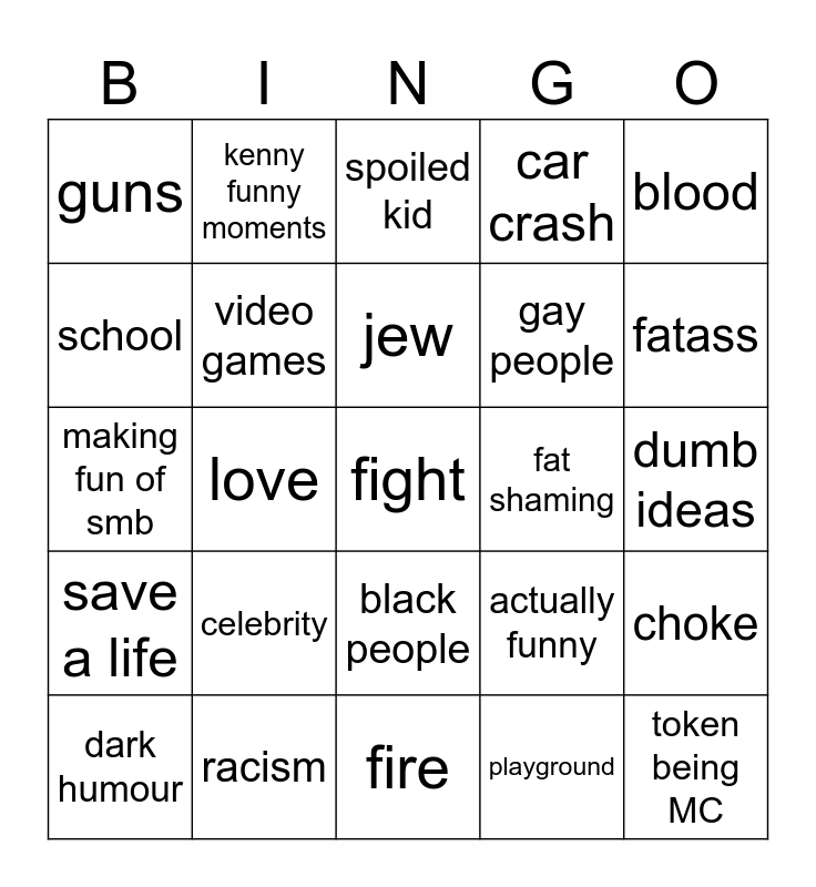This bingo card has a free space and 24 words: celebrity, racism, jew, dark humour, blood, guns, school, kenny funny moments, fat shaming, black people, gay people, making fun of smb, actually funny, choke, video games, playground, dumb ideas, spoiled kid, fatass, love, token being MC, save a life, car crash and fire.