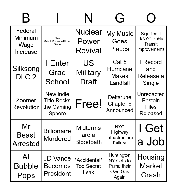 This bingo card has a free space and 24 words: Billionaire Murdered, JD Vance Becomes President, US Military Draft, AI Bubble Pops, Significant LI/NYC Public Transit Improvements, Federal Minimum Wage Increase, Silksong DLC 2, New Metroid/Splatoon/Pikmin Game, Deltarune Chapter 6 Announced, Midterms are a Bloodbath, Cat 5 Hurricane Makes Landfall, Zoomer Revolution, NYC Highway Infrastructure Failure, I Get a Job, I Enter Grad School, Huntington NY Gets to Pump their Own Gas Again, Unredacted Epstein Files Released, Nuclear Power Revival, I Record and Release a Single, New Indie Title Rocks the Gaming Sphere, Housing Market Crash, Mr Beast Arrested, My Music Goes Places and "Accidental" Top Secret Leak.