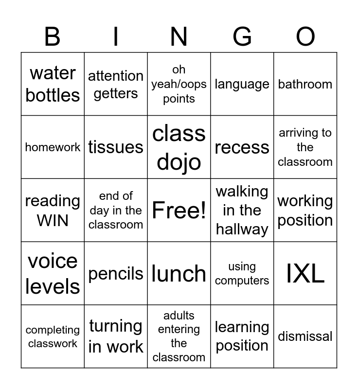 This bingo card has a free space and 24 words: pencils, turning in work, class dojo, completing classwork, bathroom, water bottles, homework, attention getters, walking in the hallway, lunch, recess, reading WIN, using computers, IXL, tissues, learning position, working position, oh yeah/oops points, arriving to the classroom, end of day in the classroom, dismissal, voice levels, language and adults entering the classroom.