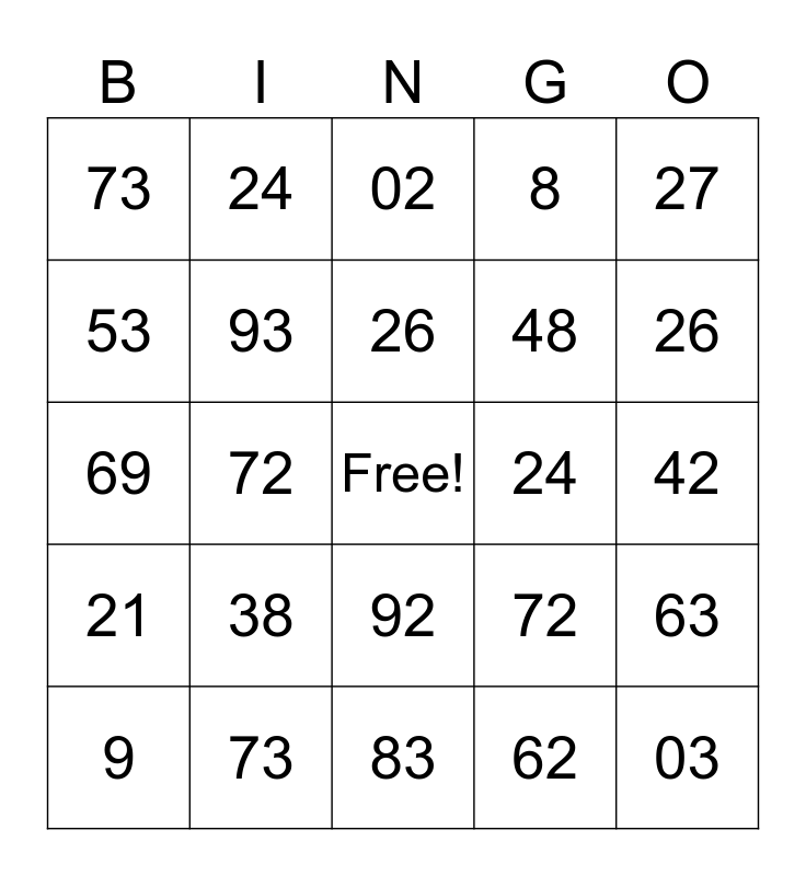 This bingo card has a free space and 24 words: 38, 73, 26, 9, 27, 73, 53, 24, 24, 92, 48, 69, 72, 63, 93, 62, 42, 02, 26, 72, 03, 21, 8 and 83.