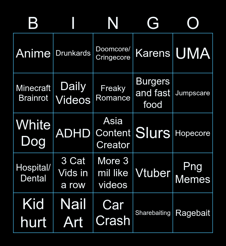 This bingo card has 25 words: 3 Cat Vids in a row, Car Crash, Freaky Romance, Kid hurt, UMA, Anime, Minecraft Brainrot, Drunkards, Slurs, More 3 mil like videos, Burgers and fast food, White Dog, Vtuber, Png Memes, Daily Videos, Ragebait, Hopecore, Doomcore/ Cringecore, Jumpscare, ADHD, Asia Content Creator, Nail Art, Hospital/ Dental, Karens and Sharebaiting.