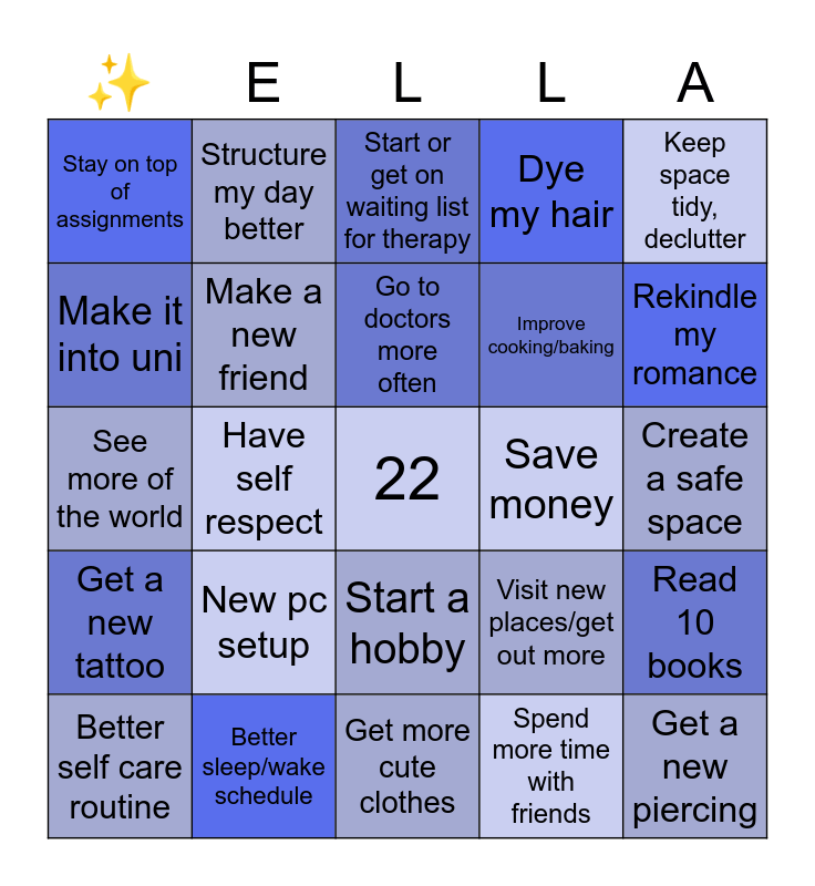 This bingo card has a free space and 24 words: New pc setup, Better sleep/wake schedule, Go to doctors more often, Better self care routine, Keep space tidy, declutter, Stay on top of assignments, Make it into uni, Structure my day better, Save money, Start a hobby, Improve cooking/baking, See more of the world, Visit new places/get out more, Read 10 books, Make a new friend, Spend more time with friends, Create a safe space, Start or get on waiting list for therapy, Rekindle my romance, Have self respect, Get a new piercing, Get a new tattoo, Dye my hair and Get more cute clothes.