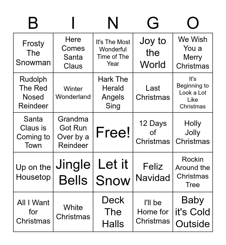 This bingo card has a free space and 25 words: Jingle Bells, Deck The Halls, Hark The Herald Angels Sing, All I Want for Christmas, We Wish You a Merry Christmas, Frosty The Snowman, Rudolph The Red Nosed Reindeer, Here Comes Santa Claus, 12 Days of Christmas, Let it Snow, Last Christmas, Santa Claus is Coming to Town, Feliz Navidad, Rockin Around the Christmas Tree, Winter Wonderland, Sleigh Ride, Holly Jolly Christmas, It's The Most Wonderful Time of The Year, It's Beginning to Look a Lot Like Christmas, Grandma Got Run Over by a Reindeer, Baby it's Cold Outside, White Christmas, Up on the Housetop, Joy to the World and I'll be Home for Christmas.