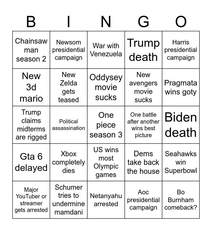 This bingo card has 25 words: Xbox completely dies, Netanyahu arrested, Oddysey movie sucks, Major YouTuber or streamer gets arrested, Harris presidential campaign, Chainsaw man season 2, New 3d mario, Newsom presidential campaign, One battle after another wins best picture, US wins most Olympic games, New avengers movie sucks, Trump claims midterms are rigged, Dems take back the house, Seahawks win Superbowl, New Zelda gets teased, Bo Burnham comeback?, Biden death, War with Venezuela, Pragmata wins goty, Political assassination, One piece season 3, Schumer tries to undermine mamdani, Gta 6 delayed, Trump death and Aoc presidential campaign.