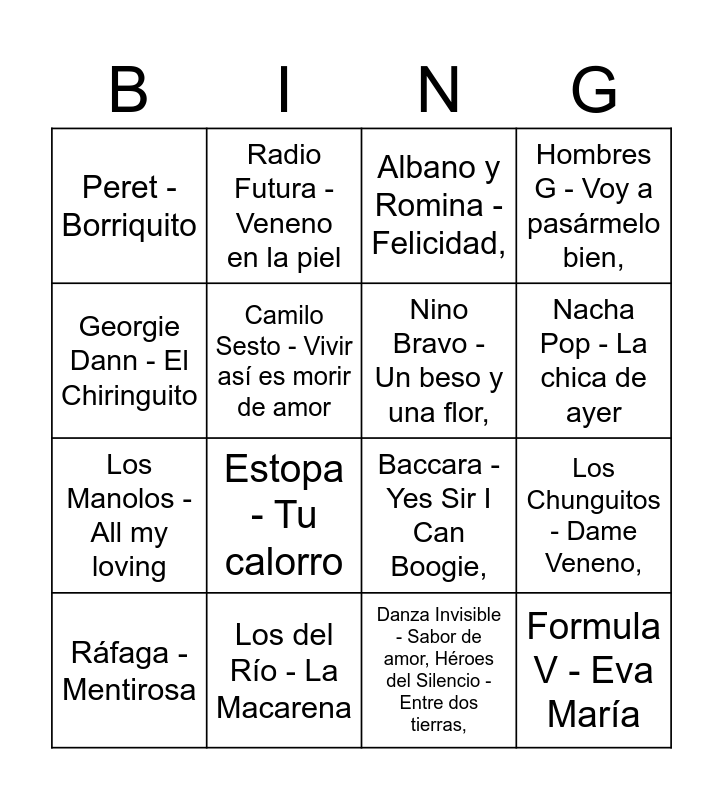 This bingo card has 48 words: Free!, Ráfaga - Mentirosa, Pedrito Fernández - La de la mochila azul, Danny Daniel - El vals de las mariposas, Julio Iglesias - Soy un truhán soy un señor, Julio Iglesias - Me va me va, Radio Futura - Escuela de calor,, Radio Futura - Veneno en la piel, Raphael - Mi gran noche, Camilo Sesto - Vivir así es morir de amor, Rocío Jurado - Como una ola, Nino Bravo - Un beso y una flor,, Hombres G - Voy a pasármelo bien,, Alaska y Dinarama - Ni tú ni nadie, Los Secretos - Déjame, Loquillo - Feo fuerte y formal,, Duncan Dhu - En algún lugar, Nacha Pop - La chica de ayer, Los del Río - La Macarena, King África - La Bomba, Georgie Dann - El Chiringuito, Los Chunguitos - Dame Veneno,, Azúcar Moreno - Solo se vive una vez, Peret - Borriquito, Los Manolos - All my loving, Gipsy Kings - Volare, Estopa - Tu calorro, El Fary - El toro guapo, Lola Flores - Sarandonga, Jeanette - Porque te va, Formula V - Eva María, Los Diablos - Un rayo de sol, Manolo Escobar - Mi carro, Paloma San Basilio - Juntos,, Mecano - Me colé en una fiesta,, Tequila - Salta, Seguridad Social - Chiquilla, La Guardia - Mil calles llevan hacia ti, Modestia Aparte - Cosas de la edad, Danza Invisible - Sabor de amor, Héroes del Silencio - Entre dos tierras,, Miguel Bosé - Amante Bandido,, Karina - El baúl de los recuerdos,, Marisol - Estando contigo,, cecilia - Dama dama,, Albano y Romina - Felicidad,, Raffaella Carrà - Hay que venir al sur,, Baccara - Yes Sir I Can Boogie,, Los Bravos - Black is Black,, José Luis Perales - Y cómo es él, and Antonio Machín - Dos gardenias..