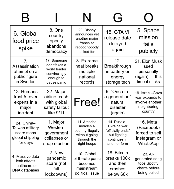 This bingo card has a free space and 24 words: 1. Major Western government collapses or snap election, 2. New pandemic scare (not full lockdowns), 3. Extreme heat breaks multiple national records, 4. Massive data leak affects healthcare or DNA databases, 5. Space mission fails publicly, 6. Global food price spike, 7. Assassination attempt on a public figure in Sweden, 8. One country openly abandons democracy, 9. “Once-in-a-generation” natural disaster (again), 11. America invades a country illegally without going through the right hoops, 12. Breakthrough in battery or energy storage tech, 13. Humans trust AI over experts in a major incident, 14. Russia–Ukraine war “officially ends” but fighting continues in another form, 16. Meta (Facebook) forced to sell Instagram or WhatsApp, 17. Someone deepfakes a world leader convincingly enough to cause panic, 18. Bitcoin breaks 100k and then crashes below 60k, 19. Israel–Gaza war expands to involve another neighboring country, 20. Disney announces yet another major franchise reboot nobody asked for, 21. Elon Musk sued personally (again) — this time it sticks, 22. Major airline crash with global safety fallout like 9/11, 23. AI-generated song tops Spotify charts before being pulled, 24. China–Taiwan military scare stops global shipping for days, 15. GTA VI release date delayed again and 10. Global birth-rate panic becomes mainstream political issue.