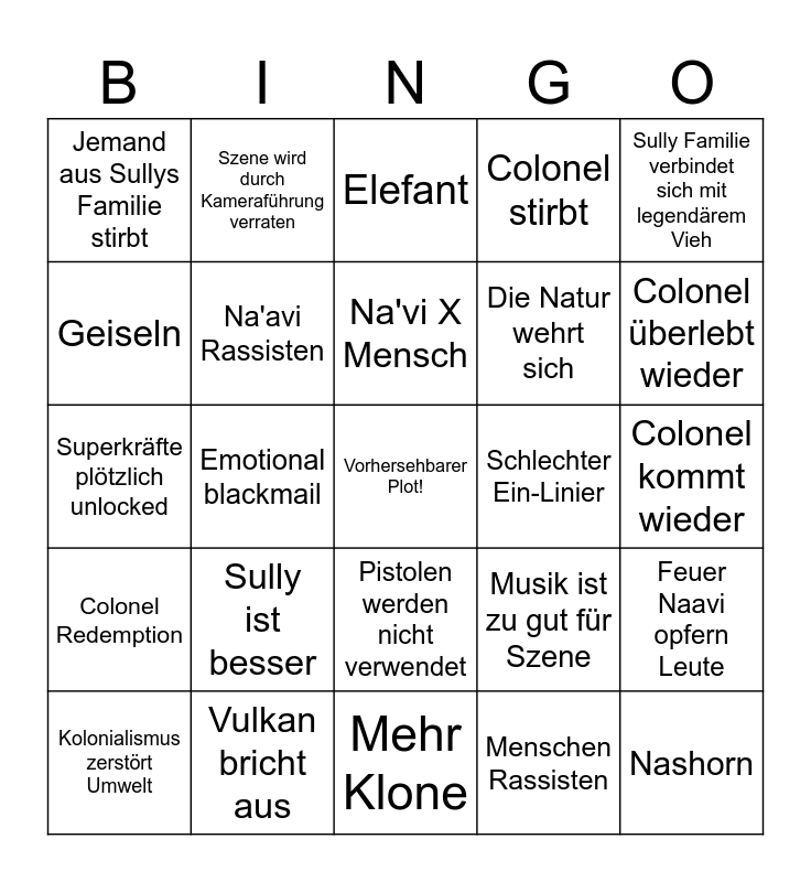 This bingo card has a free space and 24 words: Sully ist besser, Vulkan bricht aus, Na'vi X Mensch, Kolonialismus zerstört Umwelt, Sully Familie verbindet sich mit legendärem Vieh, Jemand aus Sullys Familie stirbt, Geiseln, Szene wird durch Kameraführung verraten, Schlechter Ein-Linier, Pistolen werden nicht verwendet, Die Natur wehrt sich, Superkräfte plötzlich unlocked, Musik ist zu gut für Szene, Feuer Naavi opfern Leute, Na'avi Rassisten, Menschen Rassisten, Colonel kommt wieder, Elefant, Colonel überlebt wieder, Emotional blackmail, Nashorn, Colonel Redemption, Colonel stirbt and Mehr Klone.