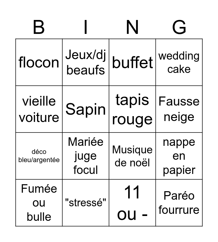 This bingo card has 16 words: "stressé", nappe en papier, buffet, flocon, déco bleu/argentée, Jeux/dj beaufs, Musique de noël, 11 ou -, vieille voiture, Sapin, Fumée ou bulle, wedding cake, Mariée juge focul, Fausse neige, tapis rouge and Paréo fourrure.