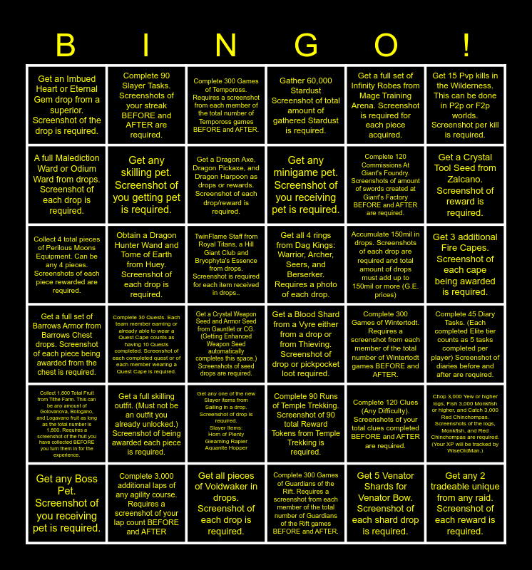 This bingo card has 36 words: Complete 90 Runs of Temple Trekking. Screenshot of 90 total Reward Tokens from Temple Trekking is required., Get any one of the new Slayer items from Sailing in a drop. Screenshot of drop is required. Slayer Items: Horn of Plenty Gleaming Rapier Aquanite Hopper, Complete 300 Games of Guardians of the Rift. Requires a screenshot from each member of the total number of Guardians of the Rift games BEFORE and AFTER., A full Malediction Ward or Odium Ward from drops. Screenshot of each drop is required., Get a full set of Barrows Armor from Barrows Chest drops. Screenshot of each piece being awarded from the chest is required., Get all 4 rings from Dag Kings: Warrior, Archer, Seers, and Berserker. Requires a photo of each drop., Get any skilling pet. Screenshot of you getting pet is required., Get all pieces of Voidwaker in drops. Screenshot of each drop is required., Get a full set of Infinity Robes from Mage Training Arena. Screenshot is required for each piece acquired., Complete 120 Clues (Any Difficulty). Screenshots of your total clues completed BEFORE and AFTER are required., Get a Crystal Tool Seed from Zalcano. Screenshot of reward is required., Gather 60,000 Stardust Screenshot of total amount of gathered Stardust is required., Chop 3,000 Yew or higher logs, Fish 3,000 Monkfish or higher, and Catch 3,000 Red Chinchompas. Screenshots of the logs, Monkfish, and Red Chinchompas are required. (Your XP will be tracked by WiseOldMan.), Obtain a Dragon Hunter Wand and Tome of Earth from Huey. Screenshot of each drop is required., Get any minigame pet. Screenshot of you receiving pet is required., Get an Imbued Heart or Eternal Gem drop from a superior. Screenshot of the drop is required., Collect 1,800 Total Fruit from Tithe Farm. This can be any amount of Golovanova, Bologano, and Logavano fruit as long as the total number is 1,800. Requires a screenshot of the fruit you have collected BEFORE you turn them in for the experience., Accumulate 150mil in drops. Screenshots of each drop are required and total amount of drops must add up to 150mil or more (G.E. prices), Collect 4 total pieces of Perilous Moons Equipment. Can be any 4 pieces. Screenshots of each piece rewarded are required., Complete 300 Games of Tempoross. Requires a screenshot from each member of the total number of Tempoross games BEFORE and AFTER., TwinFlame Staff from Royal Titans, a Hill Giant Club and Bryophyta's Essence from drops. Screenshot is required for each item received in drops.., Complete 30 Quests. Each team member earning or already able to wear a Quest Cape counts as having 10 Quests completed. Screenshot of each completed quest or of each member wearing a Quest Cape is required., Get a Blood Shard from a Vyre either from a drop or from Thieving. Screenshot of drop or pickpocket loot required., Get a Crystal Weapon Seed and Armor Seed from Gauntlet or CG. (Getting Enhanced Weapon Seed automatically completes this space.) Screenshots of seed drops are required., Complete 300 Games of Wintertodt. Requires a screenshot from each member of the total number of Wintertodt games BEFORE and AFTER., Complete 90 Slayer Tasks. Screenshots of your streak BEFORE and AFTER are required., Complete 120 Commissions At Giant's Foundry. Screenshots of amount of swords created at Giant's Factory BEFORE and AFTER are required., Complete 3,000 additional laps of any agility course. Requires a screenshot of your lap count BEFORE and AFTER, Get a Dragon Axe, Dragon Pickaxe, and Dragon Harpoon as drops or rewards. Screenshot of each drop/reward is required., Get 15 Pvp kills in the Wilderness. This can be done in P2p or F2p worlds. Screenshot per kill is required., Get any 2 tradeable unique from any raid. Screenshot of each reward is required., Get any Boss Pet. Screenshot of you receiving pet is required., Complete 45 Diary Tasks. (Each completed Elite tier counts as 5 tasks completed per player) Screenshot of diaries before and after are required., Get 3 additional Fire Capes. Screenshot of each cape being awarded is required., Get a full skilling outfit. (Must not be an outfit you already unlocked.) Screenshot of being awarded each piece is required. and Get 5 Venator Shards for Venator Bow. Screenshot of each shard drop is required..
