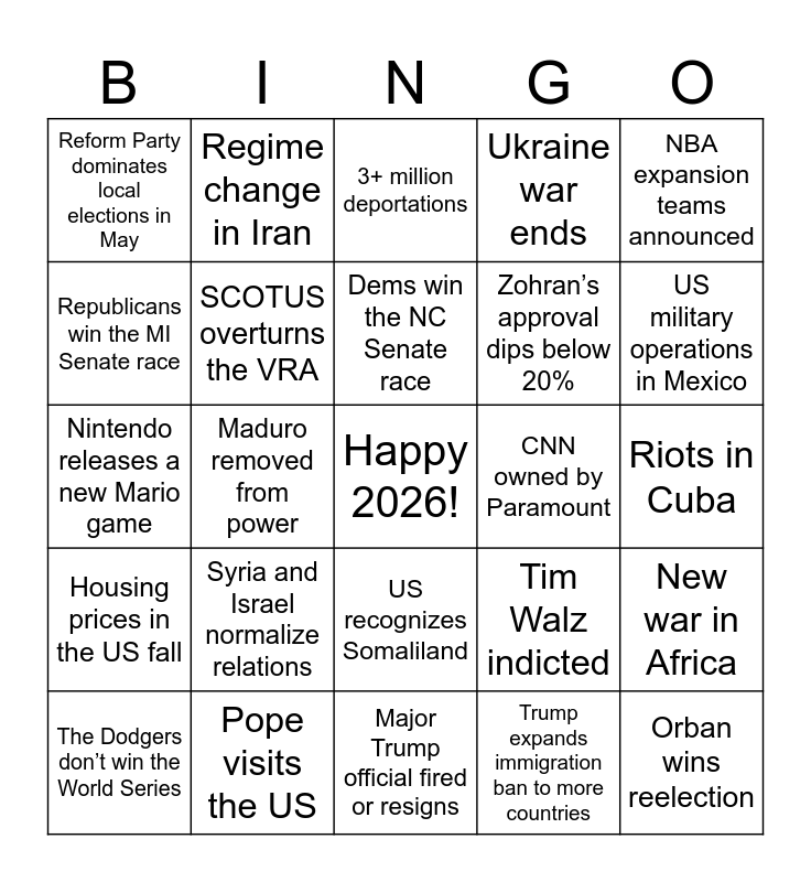This bingo card has a free space and 24 words: Syria and Israel normalize relations, Pope visits the US, Dems win the NC Senate race, The Dodgers don’t win the World Series, NBA expansion teams announced, Reform Party dominates local elections in May, Republicans win the MI Senate race, Regime change in Iran, CNN owned by Paramount, US recognizes Somaliland, Zohran’s approval dips below 20%, Nintendo releases a new Mario game, Tim Walz indicted, New war in Africa, SCOTUS overturns the VRA, Trump expands immigration ban to more countries, Riots in Cuba, 3+ million deportations, US military operations in Mexico, Maduro removed from power, Orban wins reelection, Housing prices in the US fall, Ukraine war ends and Major Trump official fired or resigns.
