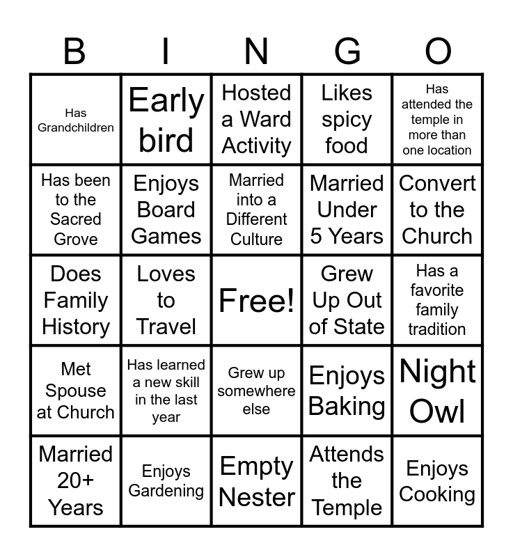 This bingo card has a free space and 29 words: Married 20+ Years, Served a Mission, Loves to Travel, Reads for Fun, Has Grandchildren, Hosted a Ward Activity, Enjoys Board Games, Has learned a new skill in the last year, Grew Up Out of State, Enjoys Gardening, Has a favorite family tradition, Enjoys Cooking, Empty Nester, Attends the Temple, Convert to the Church, Outdoor Hobby, Grew up somewhere else, Met Spouse at Church, Has attended the temple in more than one location, Does Family History, Enjoys Baking, Has a pet, Married Under 5 Years, Has been to the Sacred Grove, Likes spicy food, Early bird, Night Owl, Married into a Different Culture and Is only Child.