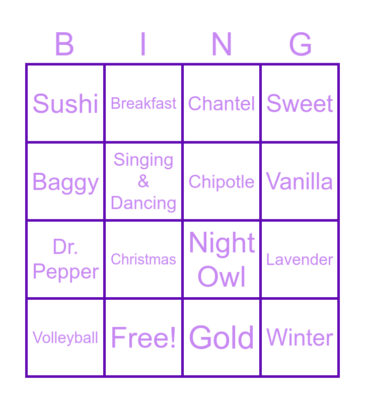 This bingo card has 16 words: Free!, Lavender, Chantel, Sushi, Dr. Pepper, Breakfast, Night Owl, Gold, Baggy, Singing & Dancing, Volleyball, Sweet, Christmas, Vanilla, Chipotle and Winter.