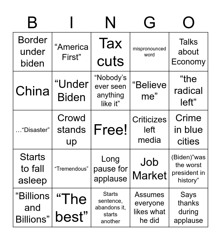 This bingo card has a free space and 24 words: “Tremendous”, “The best”, “Nobody’s ever seen anything like it”, “Billions and Billions”, Talks about Economy, Border under biden, China, “America First”, Criticizes left media, Long pause for applause, “Believe me”, …“Disaster”, Job Market, (Biden)”was the worst president in history”, “Under Biden, Assumes everyone likes what he did, Crime in blue cities, Tax cuts, “the radical left”, Crowd stands up, Says thanks during applause, Starts to fall asleep, mispronounced word and Starts sentence, abandons it, starts another.