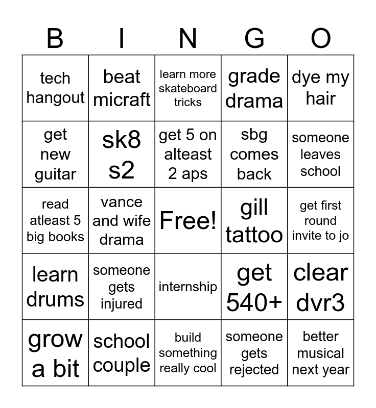 This bingo card has a free space and 24 words: grow a bit, someone gets injured, get 5 on alteast 2 aps, someone gets rejected, dye my hair, tech hangout, beat micraft, learn more skateboard tricks, gill tattoo, get first round invite to jo, read atleast 5 big books, sk8 s2, get 540+, clear dvr3, get new guitar, school couple, build something really cool, grade drama, someone leaves school, learn drums, vance and wife drama, internship, sbg comes back and better musical next year.
