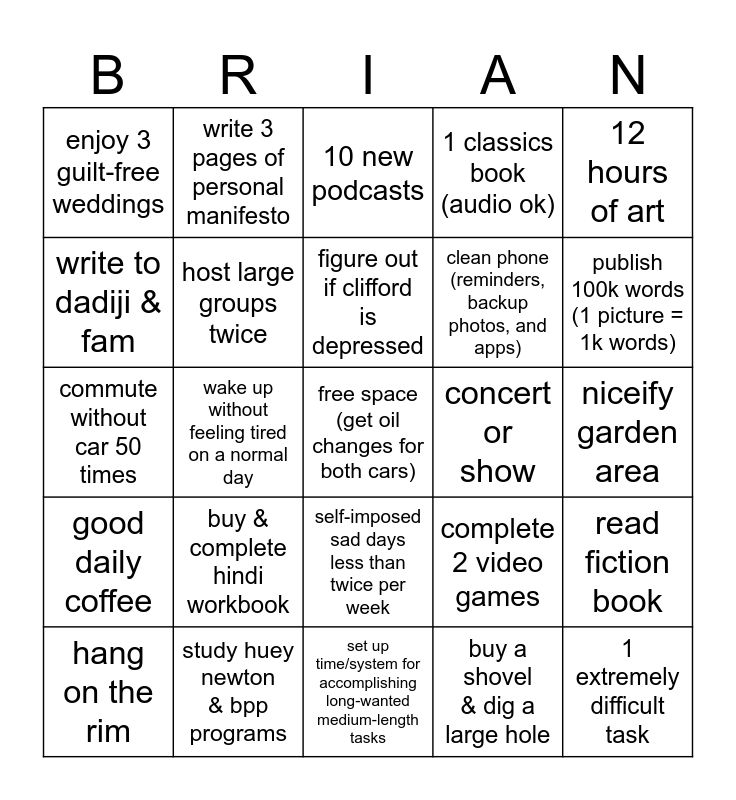 This bingo card has a free space and 24 words: buy & complete hindi workbook, study huey newton & bpp programs, figure out if clifford is depressed, hang on the rim, 12 hours of art, enjoy 3 guilt-free weddings, write to dadiji & fam, write 3 pages of personal manifesto, concert or show, self-imposed sad days less than twice per week, clean phone (reminders, backup photos, and apps), commute without car 50 times, complete 2 video games, read fiction book, host large groups twice, buy a shovel & dig a large hole, niceify garden area, 10 new podcasts, publish 100k words (1 picture = 1k words), wake up without feeling tired on a normal day, 1 extremely difficult task, good daily coffee, 1 classics book (audio ok) and set up time/system for accomplishing long-wanted medium-length tasks.