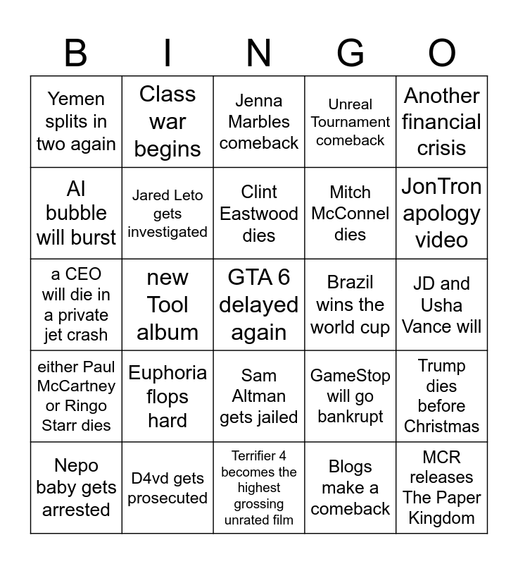 This bingo card has a free space and 24 words: Euphoria flops hard, D4vd gets prosecuted, Clint Eastwood dies, Nepo baby gets arrested, Another financial crisis, Yemen splits in two again, AI bubble will burst, Class war begins, Brazil wins the world cup, Sam Altman gets jailed, Mitch McConnel dies, a CEO will die in a private jet crash, GameStop will go bankrupt, Trump dies before Christmas, Jared Leto gets investigated, Blogs make a comeback, JD and Usha Vance will, Jenna Marbles comeback, JonTron apology video, new Tool album, MCR releases The Paper Kingdom, either Paul McCartney or Ringo Starr dies, Unreal Tournament comeback and Terrifier 4 becomes the highest grossing unrated film.