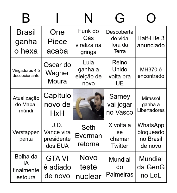 This bingo card has a free space and 24 words: J.D. Vance vira presidente dos EUA, GTA VI é adiado de novo, Lula ganha a eleição de novo, Bolha da IA finalmente estoura, Half-Life 3 anunciado, Brasil ganha o hexa, Vingadores 4 é decepcionante, One Piece acaba, Sarney vai jogar no Vasco, Seth Everman retorna, Reino Unido volta pra UE, Atualização do Mapa-múndi, X volta a se chamar Twitter, WhatsApp bloqueado no Brasil de novo, Oscar do Wagner Moura, Mundial do Palmeiras, Mirassol ganha a Libertadores, Funk do Gás viraliza na gringa, MH370 é encontrado, Capítulo novo de HxH, Mundial da GenG no LoL, Verstappen penta, Descoberta de vida fora da Terra and Novo teste nuclear.