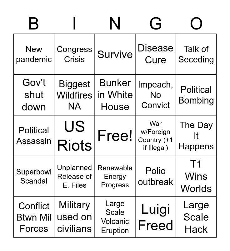 This bingo card has a free space and 24 words: Unplanned Release of E. Files, Military used on civilians, Bunker in White House, Conflict Btwn Mil Forces, Talk of Seceding, New pandemic, Gov't shut down, Congress Crisis, War w/Foreign Country (+1 if Illegal), Renewable Energy Progress, Impeach, No Convict, Political Assassin, Polio outbreak, T1 Wins Worlds, Biggest Wildfires NA, Luigi Freed, The Day It Happens, Survive, Political Bombing, US Riots, Large Scale Hack, Superbowl Scandal, Disease Cure and Large Scale Volcanic Eruption.