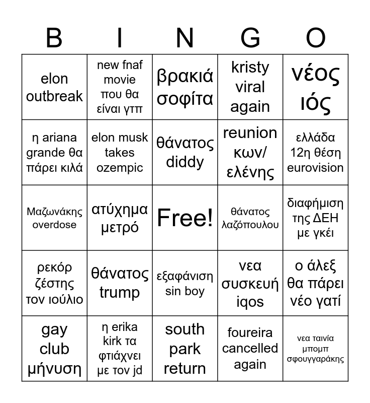 This bingo card has a free space and 24 words: θάνατος trump, η erika kirk τα φτιάχνει με τον jd, θάνατος diddy, gay club μήνυση, νέος ιός, elon outbreak, η ariana grande θα πάρει κιλά, new fnaf movie που θα είναι γτπ, θάνατος λαζόπουλου, εξαφάνιση sin boy, reunion κων/ελένης, Μαζωνάκης overdose, νεα συσκευή iqos, ο άλεξ θα πάρει νέο γατί, elon musk takes ozempic, foureira cancelled again, διαφήμιση της ΔΕΗ με γκέι, βρακιά σοφίτα, ελλάδα 12η θέση eurovision, ατύχημα μετρό, νεα ταινία μπομπ σφουγγαράκης, ρεκόρ ζέστης τον ιούλιο, kristy viral again and south park return.