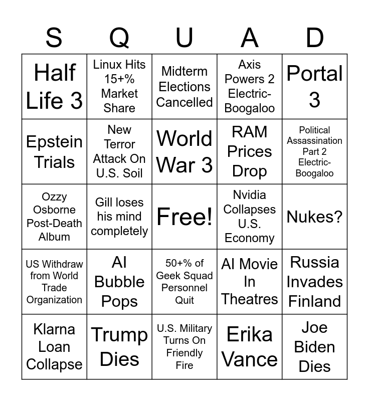 This bingo card has a free space and 24 words: AI Bubble Pops, Trump Dies, World War 3, Klarna Loan Collapse, Portal 3, Half Life 3, Epstein Trials, Linux Hits 15+% Market Share, Nvidia Collapses U.S. Economy, 50+% of Geek Squad Personnel Quit, RAM Prices Drop, Ozzy Osborne Post-Death Album, AI Movie In Theatres, Russia Invades Finland, New Terror Attack On U.S. Soil, Erika Vance, Nukes?, Midterm Elections Cancelled, Political Assassination Part 2 Electric-Boogaloo, Gill loses his mind completely, Joe Biden Dies, US Withdraw from World Trade Organization, Axis Powers 2 Electric-Boogaloo and U.S. Military Turns On Friendly Fire.