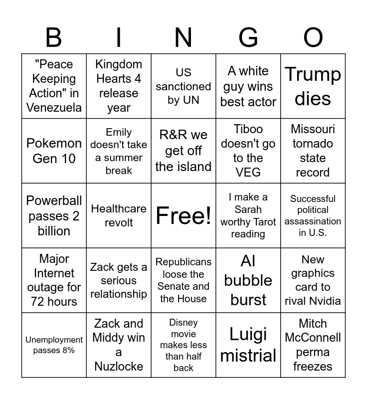 This bingo card has a free space and 24 words: Zack gets a serious relationship, Zack and Middy win a Nuzlocke, R&R we get off the island, Unemployment passes 8%, Trump dies, "Peace Keeping Action" in Venezuela, Pokemon Gen 10, Kingdom Hearts 4 release year, I make a Sarah worthy Tarot reading, Republicans loose the Senate and the House, Tiboo doesn't go to the VEG, Powerball passes 2 billion, AI bubble burst, New graphics card to rival Nvidia, Emily doesn't take a summer break, Luigi mistrial, Successful political assassination in U.S., US sanctioned by UN, Missouri tornado state record, Healthcare revolt, Mitch McConnell perma freezes, Major Internet outage for 72 hours, A white guy wins best actor and Disney movie makes less than half back.