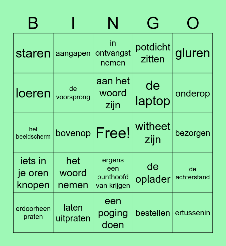 This bingo card has a free space and 24 words: het woord nemen, laten uitpraten, aan het woord zijn, erdoorheen praten, gluren, staren, loeren, aangapen, witheet zijn, ergens een punthoofd van krijgen, de laptop, het beeldscherm, de oplader, de achterstand, de voorsprong, bestellen, bezorgen, in ontvangst nemen, onderop, bovenop, ertussenin, iets in je oren knopen, potdicht zitten and een poging doen.