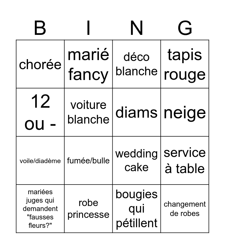 This bingo card has 16 words: robe princesse, service à table, déco blanche, chorée, voile/diadème, marié fancy, wedding cake, bougies qui pétillent, 12 ou -, voiture blanche, mariées juges qui demandent "fausses fleurs?", tapis rouge, fumée/bulle, neige, diams and changement de robes.