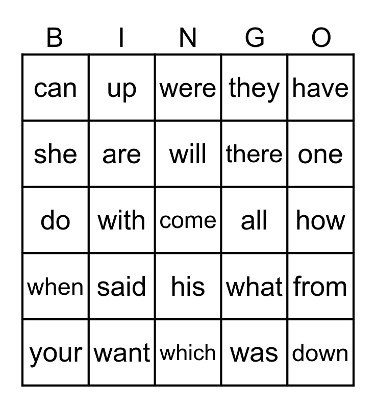 This bingo card has 25 words: said, which, will, your, have, can, she, up, all, his, there, do, what, from, are, down, how, were, one, with, come, want, when, they and was.