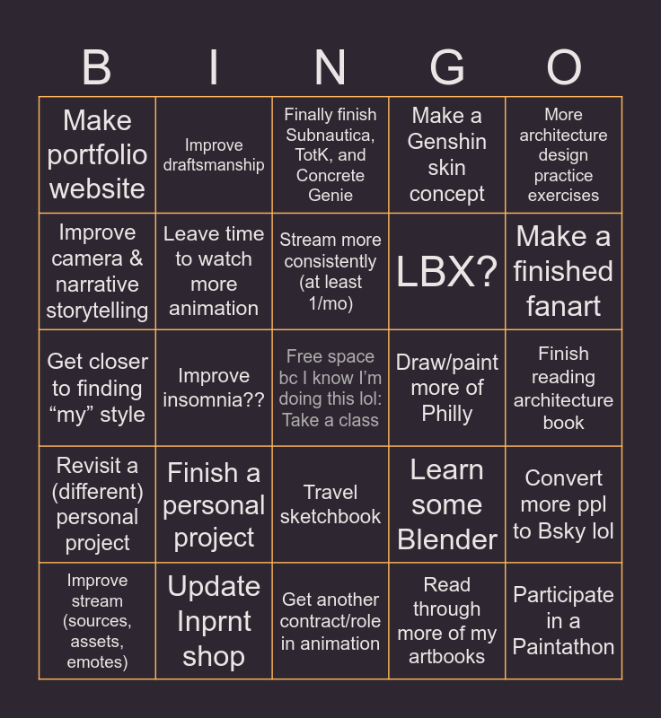This bingo card has a free space and 24 words: Finish a personal project, Update Inprnt shop, Stream more consistently (at least 1/mo), Improve stream (sources, assets, emotes), More architecture design practice exercises, Make portfolio website, Improve camera & narrative storytelling, Improve draftsmanship, Draw/paint more of Philly, Travel sketchbook, LBX?, Get closer to finding “my” style, Learn some Blender, Convert more ppl to Bsky lol, Leave time to watch more animation, Read through more of my artbooks, Finish reading architecture book, Finally finish Subnautica, TotK, and Concrete Genie, Make a finished fanart, Improve insomnia??, Participate in a Paintathon, Revisit a (different) personal project, Make a Genshin skin concept and Get another contract/role in animation.