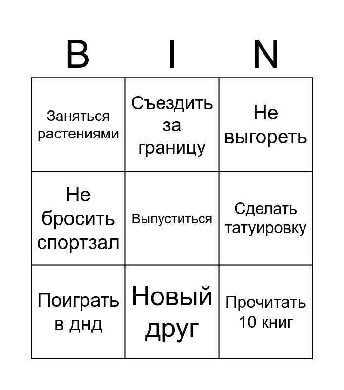 This bingo card has a free space and 8 words: Сделать татуировку, Не выгореть, Съездить за границу, Поиграть в днд, Заняться растениями, Прочитать 10 книг, Не бросить спортзал and Новый друг.