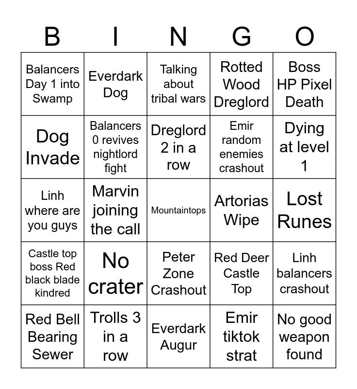 This bingo card has a free space and 24 words: No crater, Trolls 3 in a row, Dreglord 2 in a row, Red Bell Bearing Sewer, Boss HP Pixel Death, Balancers Day 1 into Swamp, Dog Invade, Everdark Dog, Artorias Wipe, Peter Zone Crashout, Emir random enemies crashout, Linh where are you guys, Red Deer Castle Top, Linh balancers crashout, Balancers 0 revives nightlord fight, Emir tiktok strat, Lost Runes, Talking about tribal wars, Dying at level 1, Marvin joining the call, No good weapon found, Castle top boss Red black blade kindred, Rotted Wood Dreglord and Everdark Augur.