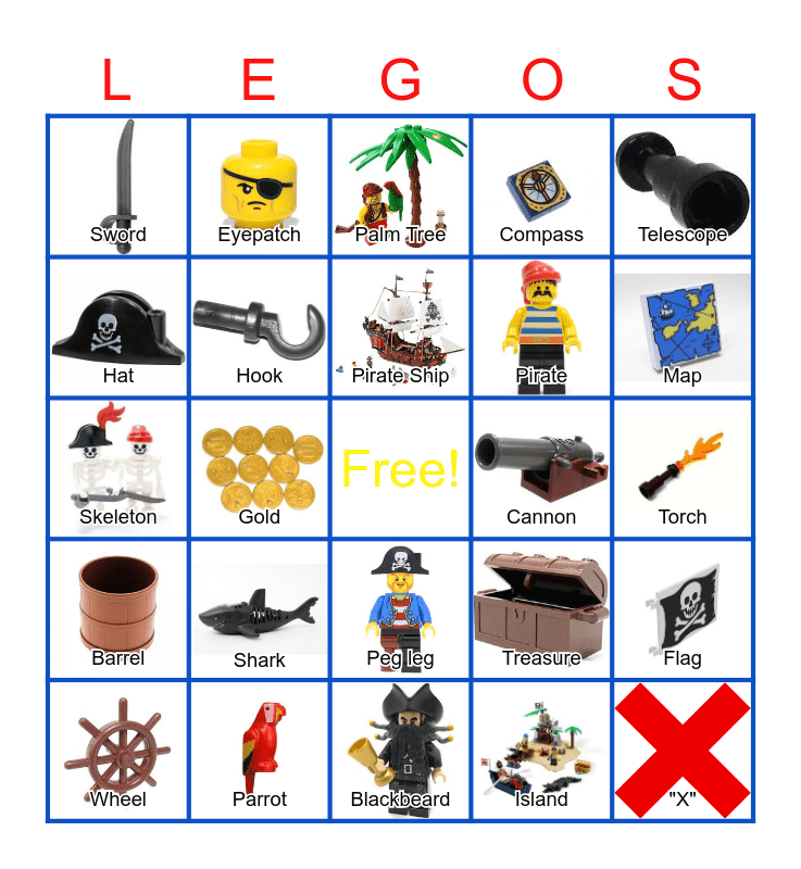 This bingo card has 24 images, a free space and 24 words: Shark, Parrot, Pirate Ship, Wheel, Telescope, Sword, Hat, Eyepatch, Cannon, Peg leg, Pirate, Skeleton, Treasure, Flag, Hook, Island, Torch, Palm Tree, Map, Gold, "X", Barrel, Compass and Blackbeard.