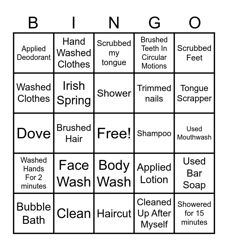 This bingo card has a free space and 24 words: Face Wash, Clean, Shower, Bubble Bath, Scrubbed Feet, Applied Deodorant, Washed Clothes, Hand Washed Clothes, Shampoo, Body Wash, Trimmed nails, Dove, Applied Lotion, Used Bar Soap, Irish Spring, Cleaned Up After Myself, Used Mouthwash, Scrubbed my tongue, Tongue Scrapper, Brushed Hair, Showered for 15 minutes, Washed Hands For 2 minutes, Brushed Teeth In Circular Motions and Haircut.