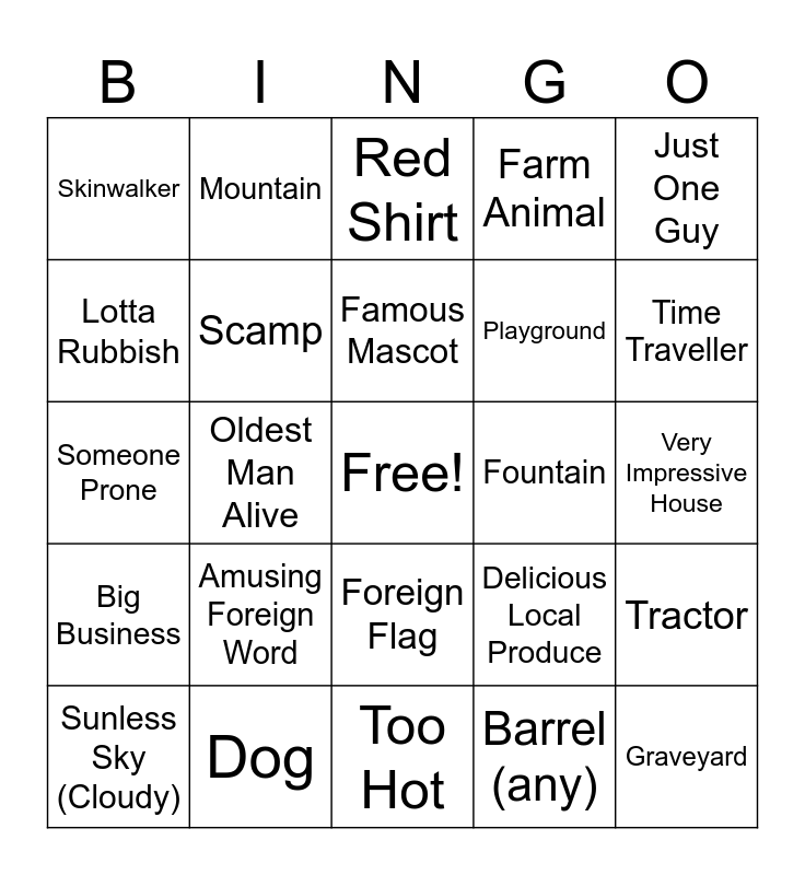 This bingo card has a free space and 24 words: Amusing Foreign Word, Dog, Famous Mascot, Sunless Sky (Cloudy), Just One Guy, Skinwalker, Lotta Rubbish, Mountain, Fountain, Foreign Flag, Playground, Someone Prone, Delicious Local Produce, Tractor, Scamp, Barrel (any), Very Impressive House, Red Shirt, Time Traveller, Oldest Man Alive, Graveyard, Big Business, Farm Animal and Too Hot.