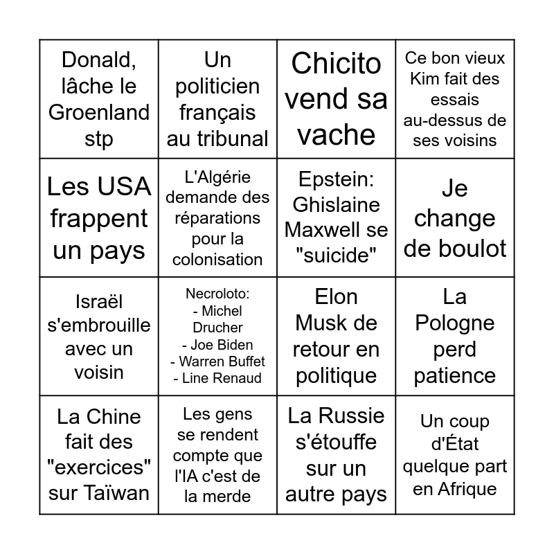 This bingo card has 16 words: Les gens se rendent compte que l'IA c'est de la merde, La Pologne perd patience, Chicito vend sa vache, Donald, lâche le Groenland stp, Israël s'embrouille avec un voisin, Un politicien français au tribunal, Elon Musk de retour en politique, La Russie s'étouffe sur un autre pays, Les USA frappent un pays, L'Algérie demande des réparations pour la colonisation, La Chine fait des "exercices" sur Taïwan, Ce bon vieux Kim fait des essais au-dessus de ses voisins, Necroloto: - Michel Drucher - Joe Biden - Warren Buffet - Line Renaud, Je change de boulot, Epstein: Ghislaine Maxwell se "suicide" and Un coup d'État quelque part en Afrique.