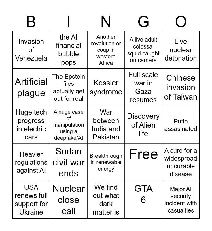 This bingo card has 25 words: Sudan civil war ends, We find out what dark matter is, Kessler syndrome, USA renews full support for Ukraine, Live nuclear detonation, Invasion of Venezuela, Artificial plague, the AI financial bubble pops, Discovery of Alien life, Breakthrough in renewable energy, Full scale war in Gaza resumes, Huge tech progress in electric cars, Free, A cure for a widespread uncurable disease, The Epstein files actually get out for real, Major AI security incident with casualties, Putin assasinated, Another revolution or coup in western Africa, Chinese invasion of Taiwan, A huge case of manipulation using a deepfake/AI, War between India and Pakistan, Nuclear close call, Heavier regulations against AI, A live adult colossal squid caught on camera and GTA 6.