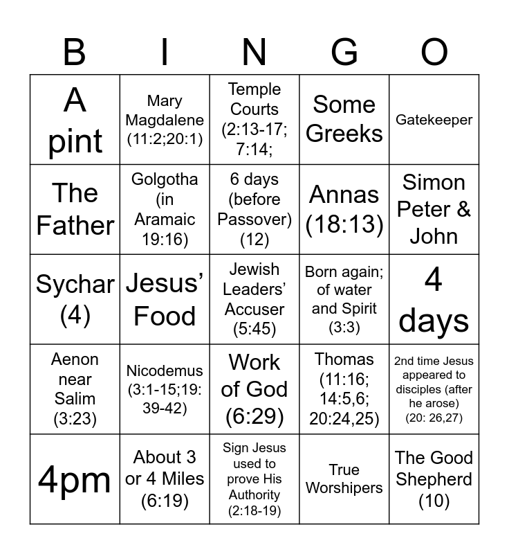This bingo card has 136 words: Grace & Truth, -Jewish Leaders -priests -Levites -Pharisees, That Jesus might be revealed to Israel, Form of a dove, Rabbi/ Rabboni in Aramaic, Andrew, 4pm, Find his brother Simon + tell him “we have found the Messiah.”, Messiah, Fig tree, Nathanael (1:45-49), Moses+ Prophets, Bethany (1:28), John’s Testimony (1:19-24;32-34), Bethsaida (1:44), Simon Peter (1:42; 18:10), A wedding (2:1-11), Jesus’ mother said: (2:3,5), 6 stone water jars (2:6), First of signs to reveal His Glory (2:11), Sign Jesus used to prove His Authority (2:18-19), 46 years, Temple Courts (2:13-17; 7:14;, Capernaum (2:12; 4:46; 6:59), All celebrated in Jerusalem, Nicodemus (3:1-15;19: 39-42), Born again; of water and Spirit (3:3), Wind (3:8), May have eternal life, Judean countryside (3:22), Aenon near Salim (3:23), Sychar (4), True Worshipers, Jesus’ Food, 5, 4 months (4:35), 1pm (4:52), Jesus’ 2nd Sign performed (4:54), Bethesda (in Aramaic) (5:2), 38 years (5:5), Jewish Leaders’ Accuser (5:45), Sea of Galilee, 1/2 a years wages (6:7), 5 small barley loaves+ 2 small fish, 5,000 (6:10), About 3 or 4 Miles (6:19), Tiberias (6:23), Seal of approval (6:27), Work of God (6:29), “You are the Holy One of God.” (6:69), Judas, Moses, Temple Guards (7:45-49), Mount of Olives (7:53), Woman caught in adultery (8:2-11), The devil, “You are not yet 50 years old” (8:57), Pool of Siloam (9:6), Sabbath, Thiefs + robbers, The Good Shepherd (10), Gatekeeper, Hired hand, Sheep, The gate, Solomon’s Colonnade (10:23), Jordan, Lazarus (11), Bethany (11), Mary Magdalene (11:2;20:1), Thomas (11:16; 14:5,6; 20:24,25), 4 days, (Meeting of) Sanhedrin (11:47), Caiaphas (11:49-53; 18:24), Ephraim (11:54), Ceremonial Cleansing, 6 days (before Passover) (12), Pure Nard, A pint, Great crowd, Young donkey, Some Greeks, Kernel of wheat ( 12:25), Isaiah (12:38-41), Evening meal (13:2), How Jesus washed disciples’ feet (13:4-11), John (18:15;20:4-10), Jesus’ new command (13:34; 15:12-17), Philip (1,6,14:9-14), Holy Spirit (14:15-18; 25-27; 15:26,27;16:7-15), 3 times, The Father, Branches (15:5), What Jesus 1st prays, What Jesus 2nd prays for, What Jesus 3rd prays for, Kidron Valley (18), Garden (18:2,3), Detachment of Soldiers -some officials from Chief Priests -Pharisees, Torches Lanterns Weapons, Malchus (18:10), Annas (18:13), Pilate, Peter’s first denial (18:18), An official nearby (18:20-22), Peter’s second denial (18:25), Peter’s third denial (18:26), Barabbas (18:40), Crown of thorns (19:2), Purple Robe (19:2,3), Caesar, Gabbatha (in Aramaic 19:13), Golgotha (in Aramaic 19:16), Notice/sign on Jesus’ cross, Aramaic Latin Greek, crucified Jesus (19:23,24), stood near the cross (19:25), A jar of wine vinegar (19:29), Stalk of hyssop plant (19:29), With a spear (19:34), Joseph (19:38), 75 pounds (19:39), Jewish burial customs (19:40), Simon Peter & John, 2 angels (20:12), 1st time Jesus appeared to His Disciples (after he arose) (20:19), Who Jesus first appeared to (21:11-18), 2nd time Jesus appeared to disciples (after he arose) (20: 26,27), About 100 yards (21:8), Fire of burning coals w/ fish and bread (21:9), 3rd time Jesus appeared to some disciples (after raised) (21), 153 large fish (21:11), “Feed my lambs” “Take care of my sheep” “Feed my sheep” (21:15-19), 7 “I am” statements, John the Baptist and Jesus.