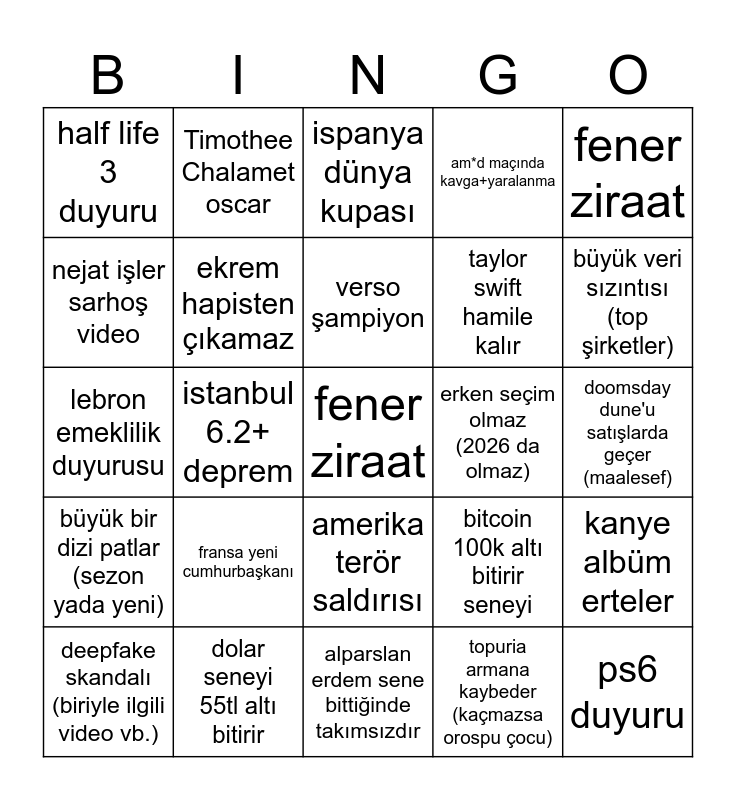 This bingo card has 25 words: fransa yeni cumhurbaşkanı, alparslan erdem sene bittiğinde takımsızdır, verso şampiyon, deepfake skandalı (biriyle ilgili video vb.), fener ziraat, half life 3 duyuru, nejat işler sarhoş video, Timothee Chalamet oscar, erken seçim olmaz (2026 da olmaz), amerika terör saldırısı, taylor swift hamile kalır, lebron emeklilik duyurusu, bitcoin 100k altı bitirir seneyi, kanye albüm erteler, ekrem hapisten çıkamaz, ps6 duyuru, doomsday dune'u satışlarda geçer (maalesef), ispanya dünya kupası, büyük veri sızıntısı (top şirketler), istanbul 6.2+ deprem, fener ziraat, dolar seneyi 55tl altı bitirir, büyük bir dizi patlar (sezon yada yeni), am*d maçında kavga+yaralanma and topuria armana kaybeder (kaçmazsa orospu çocu).