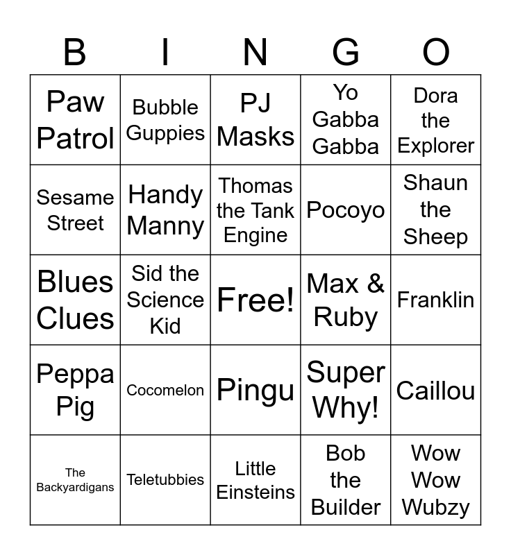 This bingo card has a free space and 24 words: Cocomelon, Teletubbies, Thomas the Tank Engine, The Backyardigans, Dora the Explorer, Paw Patrol, Sesame Street, Bubble Guppies, Max & Ruby, Pingu, Pocoyo, Blues Clues, Super Why!, Caillou, Handy Manny, Bob the Builder, Franklin, PJ Masks, Shaun the Sheep, Sid the Science Kid, Wow Wow Wubzy, Peppa Pig, Yo Gabba Gabba and Little Einsteins.
