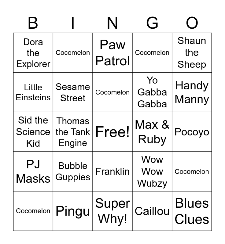 This bingo card has a free space and 29 words: Cocomelon, Teletubbies, Thomas the Tank Engine, The Backyardigans, Dora the Explorer, Paw Patrol, Sesame Street, Bubble Guppies, Max & Ruby, Pingu, Pocoyo, Blues Clues, Super Why!, Caillou, Handy Manny, Bob the Builder, Franklin, PJ Masks, Shaun the Sheep, Sid the Science Kid, Wow Wow Wubzy, Peppa Pig, Yo Gabba Gabba, Little Einsteins, Cocomelon, Cocomelon, Cocomelon, Cocomelon and Cocomelon.