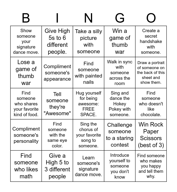 This bingo card has a free space and 24 words: Find someone with the same eye color., Give a High 5 to 3 different people, Find someone with painted nails, Find someone who likes math, Create a secret handshake with someone., Show someone your signature dance move., Lose a game of thumb war, Give High 5s to 6 different people., Sing and dance the Hokey Pokey with someone., Sing the chorus of your favorite song to someone., Walk in sync with someone across the room, Find someone who shares your favorite kind of food., Challenge someone to a staring contest, Win Rock Paper Scissors (best of 3), Compliment someone's appearance, Introduce yourself to someone you don't know, Find someone who doesn't like chocolate., Take a silly picture with someone, Draw a portrait of someone on the back of this sheet and show them., Tell someone they're "Awesome", Find someone who makes you happy and tell them why., Compliment someone's personality, Win a game of thumb war and Learn someone's signature dance move..