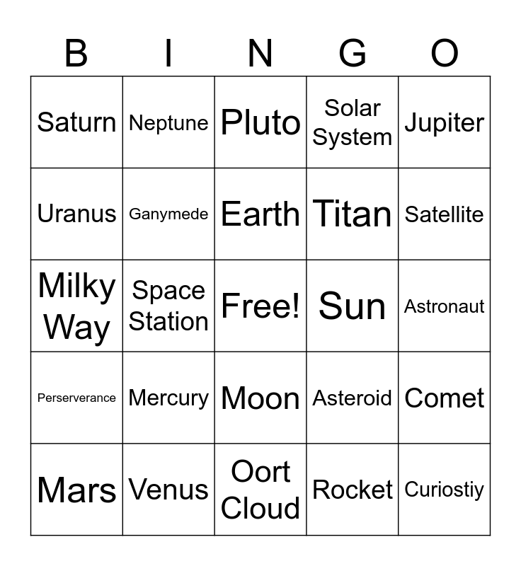 This bingo card has a free space and 24 words: Mercury, Venus, Earth, Mars, Jupiter, Saturn, Uranus, Neptune, Sun, Moon, Titan, Milky Way, Asteroid, Comet, Ganymede, Rocket, Astronaut, Pluto, Satellite, Space Station, Curiostiy, Perserverance, Solar System and Oort Cloud.