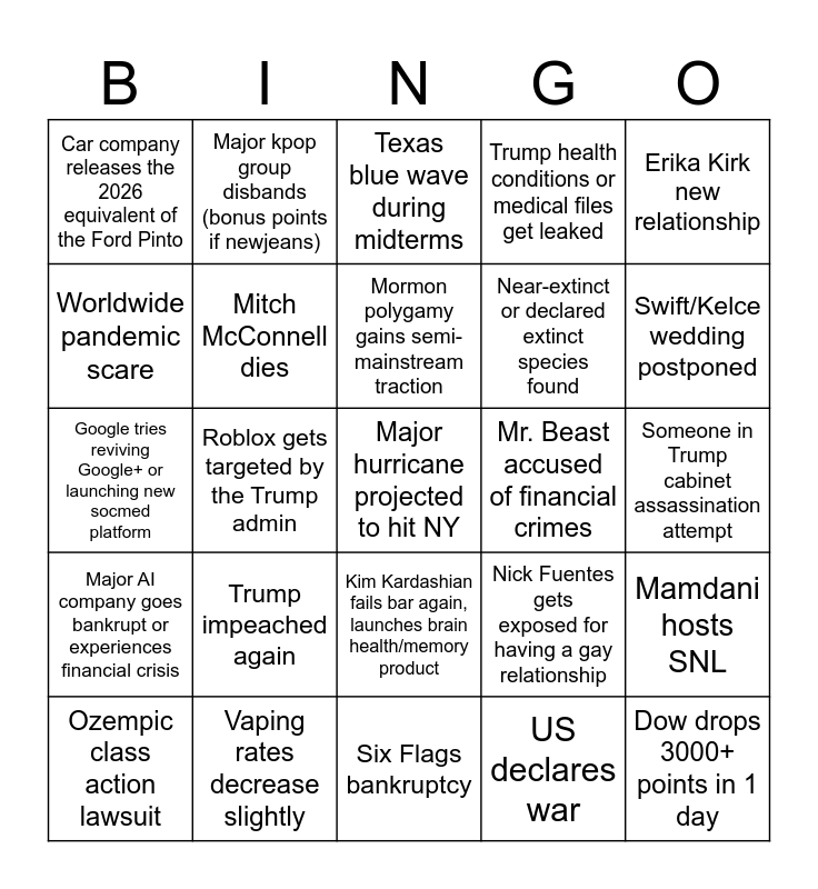 This bingo card has a free space and 24 words: Trump impeached again, Vaping rates decrease slightly, Mormon polygamy gains semi-mainstream traction, Ozempic class action lawsuit, Erika Kirk new relationship, Car company releases the 2026 equivalent of the Ford Pinto, Worldwide pandemic scare, Major kpop group disbands (bonus points if newjeans), Mr. Beast accused of financial crimes, Kim Kardashian fails bar again, launches brain health/memory product, Near-extinct or declared extinct species found, Google tries reviving Google+ or launching new socmed platform, Nick Fuentes gets exposed for having a gay relationship, Mamdani hosts SNL, Mitch McConnell dies, US declares war, Someone in Trump cabinet assassination attempt, Texas blue wave during midterms, Swift/Kelce wedding postponed, Roblox gets targeted by the Trump admin, Dow drops 3000+ points in 1 day, Major AI company goes bankrupt or experiences financial crisis, Trump health conditions or medical files get leaked and Six Flags bankruptcy.