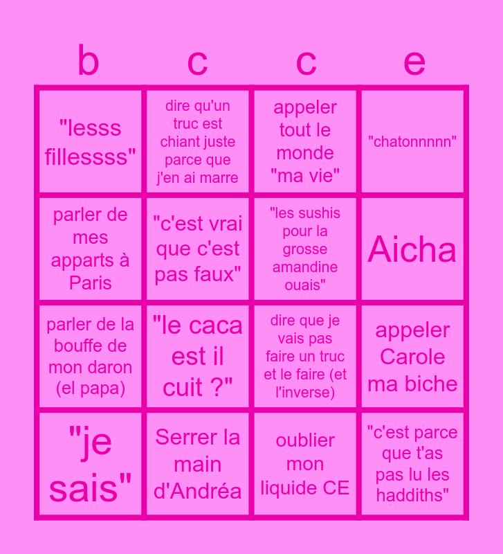 This bingo card has 16 words: Serrer la main d'Andréa, appeler Carole ma biche, appeler tout le monde "ma vie", "lesss fillessss", parler de la bouffe de mon daron (el papa), dire qu'un truc est chiant juste parce que j'en ai marre, dire que je vais pas faire un truc et le faire (et l'inverse), oublier mon liquide CE, parler de mes apparts à Paris, "c'est vrai que c'est pas faux", "je sais", "chatonnnnn", "le caca est il cuit ?", Aicha, "les sushis pour la grosse amandine ouais" and "c'est parce que t'as pas lu les haddiths".