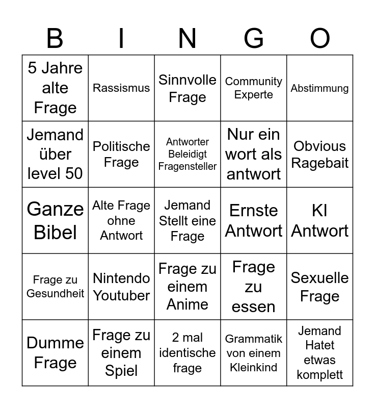 This bingo card has a free space and 24 words: Nintendo Youtuber, Frage zu einem Spiel, Antworter Beleidigt Fragensteller, Dumme Frage, Abstimmung, 5 Jahre alte Frage, Jemand über level 50, Rassismus, Ernste Antwort, Frage zu einem Anime, Nur ein wort als antwort, Ganze Bibel, Frage zu essen, Sexuelle Frage, Politische Frage, Grammatik von einem Kleinkind, KI Antwort, Sinnvolle Frage, Obvious Ragebait, Alte Frage ohne Antwort, Jemand Hatet etwas komplett, Frage zu Gesundheit, Community Experte and 2 mal identische frage.